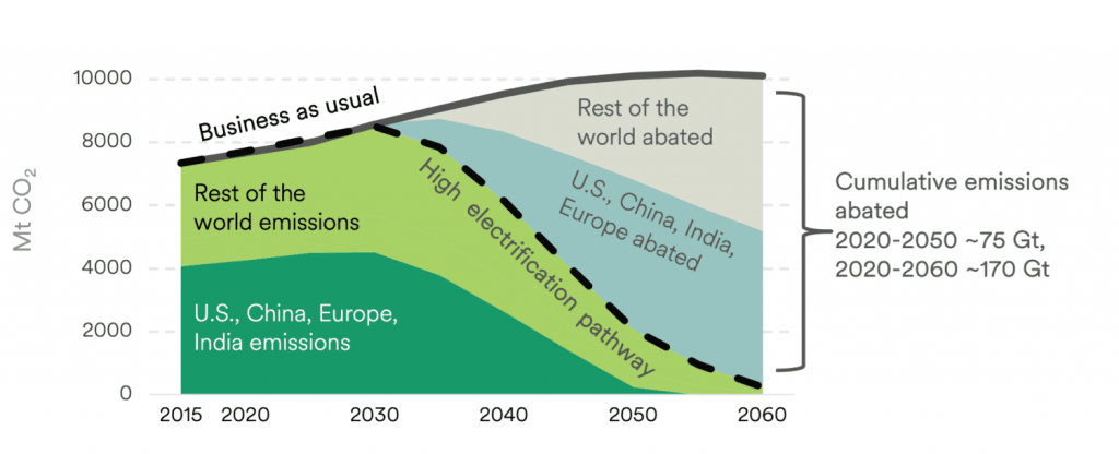 See how a high electrification pathwayimpacts emissions, with power decarbonization by 2045-2050